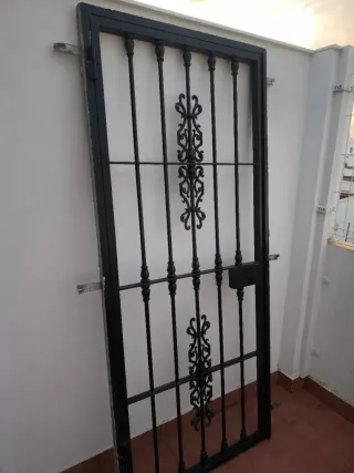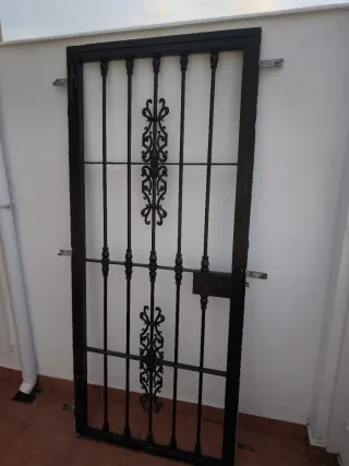 Reja de seguridad con cerradura para puerta, con un diseño clásico y elegante. medidas 200x87 En muy buen estado - Fabricada en hierro forjado. - Acabado en color negro. - Incluye adornos decorativos. - Marco resistente.