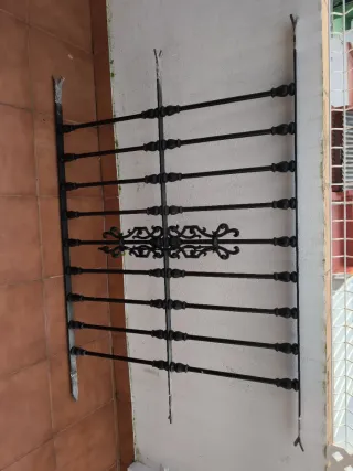 Reja de seguridad de hierro forjado, ideal para ventanas o balcones. Su diseño clásico y robusto aporta seguridad y un toque ornamental. Medidas 120x95 - Material: Hierro forjado. - Color: Negro. - Diseño con barrotes horizontales y detalles ornamentales centrales. - Estructura resistente y duradera.