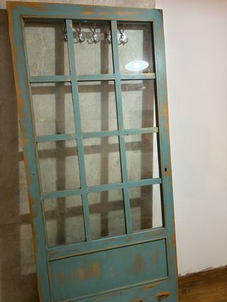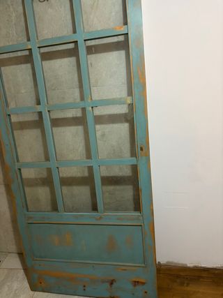 Puerta de madera con un diseño rústico y acabado envejecido. - Estructura de madera. - Acabado en color azul verdoso con detalles en madera natural. - Diseño con paneles y divisiones para cristal.