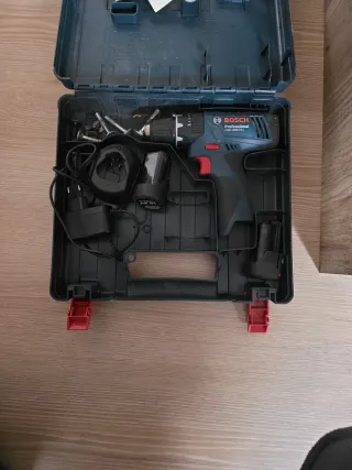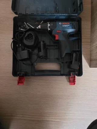 Maletín de herramientas Bosch que incluye baterías. El taladro no funciona. - Maletín de plástico resistente. - Dos baterías Bosch incluidas.