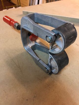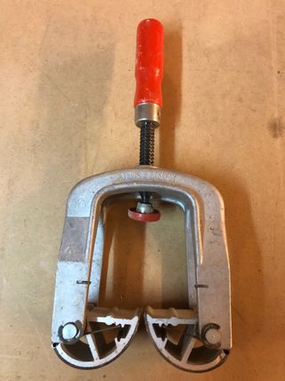 Herramienta de carpintería para encolar cantos. Permite sujetar piezas de madera de forma segura. - Cuerpo metalico - Mango de madera rojo. - Mecanismo de rosca. dispongo de 6 unidades