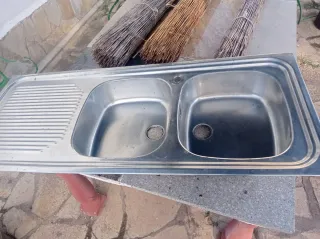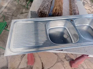 Fregadero de cocina de acero inoxidable con dos cubetas y escurridor. - Material: Acero inoxidable. - Diseño: Doble cubeta. - Incluye escurridor. - Apto para encastre. Mide 120 de ancho por 50 de profundo