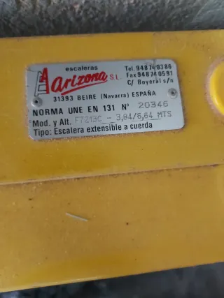 Escalera de fibra de la marca Arizona, modelo Escafibra. Se vende por cese de actividad. - Norma UNE EN 131. - Carga máxima: 150 Kg. - Ángulo de trabajo: 75°. - Línea de nivel.