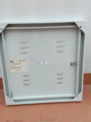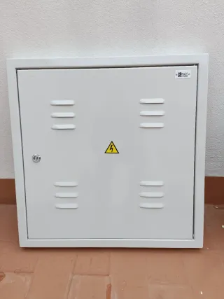 Puerta metálica para contadores trifásicos. Diseñada para proteger y facilitar el acceso a los equipos de medición eléctrica. - Material: Metal. - Color: Blanco. - Incluye cerradura y llave. - Símbolo de advertencia eléctrica visible. Medidas 600 x 600 mm. Totalmente Nueva