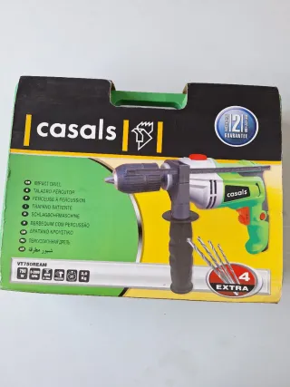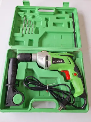 Taladro percutor Casals VT750REAM en color verde y gris. Incluye 4 brocas extra. - Potencia: 750 W - Velocidad: 0-2800 RPM - Capacidad de portabrocas: 13mm - Peso: 2,0 Kg. Tiene algo estropeado porque ha perdido potencia, pero de igual modo sigue funcionando bastante bien , pero repito, NO FUNCIONA BIEN, de hay su precio.