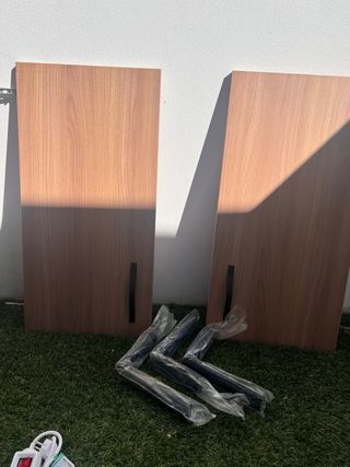 Dos puertas de armario con un diseño moderno y elegante. Listas para instalar. Medidas 80cm alto, 40cm ancho - Acabado en madera clara. - Tiradores negros incluidos. - Nunca usadas - Regalo 3 escuadras negras sin usar