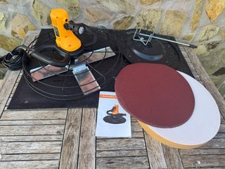 Herramienta para alisar superficies de cemento en paredes y suelos. Incluye varios accesorios. - Motor de 1200W. - Diámetro de disco de 380mm. - Incluye disco de lijado de 380mm. - Incluye plato de goma de 380mm. - Incluye plato de esponja de 380mm. - Incluye mezclador.