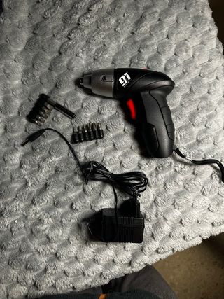 Destornillador eléctrico compacto y versátil, ideal para tareas del hogar. Incluye varios accesorios para diferentes tipos de tornillos. - Mango ergonómico para un agarre cómodo. - Incluye cargador y puntas. - Diseño en color negro y plateado.