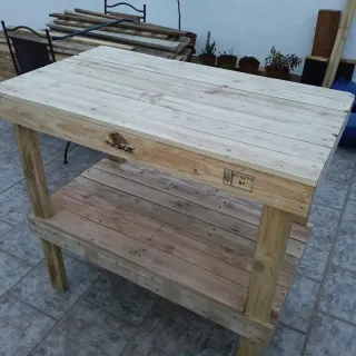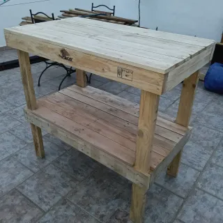 Medidas : 1,07m x 60 cm x 82 cm de alto Banco de trabajo robusto fabricado en madera, ideal para carpintería o tareas de bricolaje. Cuenta con una balda inferior para mayor espacio de almacenamiento. - Construcción sólida en madera de palletes, sin clavos, solo tornillos. - Diseño funcional con dos niveles.