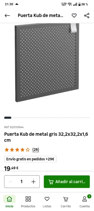 Se venden dos puertas metálicas modelo Kub de la marca Spaceo. Son de color gris y tienen un diseño perforado. La puerta de la foto tiene unas pequeñas manchas, como se ve en la foto, de hay el precio. - Material: Metal - Color: Gris - Dimensiones: 32,2x32,2x1,6 cm