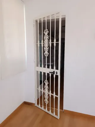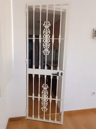 Cancela de seguridad con diseño de barrotes y adornos decorativos. Puede usarse tanto en interiores como en exteriores. - Estructura de metal. - Color blanco.