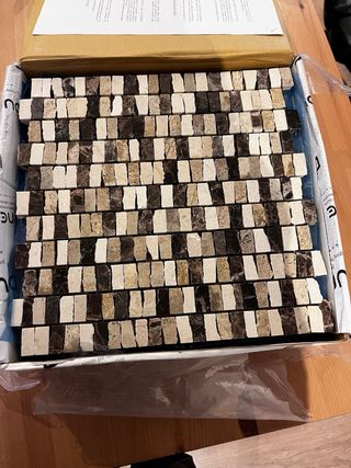 Revestimiento en malla formado por teselas de marmol emperador claro y oscuro y marmol crema acabado brillante. Son 3 cajas de 1,22 metros cuadrados cada una . La pieza mide 30,5 cm x 30,5 cm y vienen 10 por caja. El precio y el peso indicados es por caja - Diseño geométrico con bloques rectangulares. - Combinación de mármol oscuro y claro.