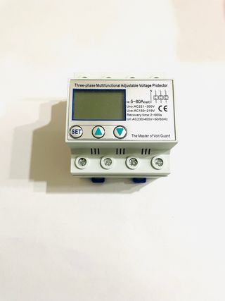 Protector de voltaje trifásico multifuncional. - Rango de corriente: 5-80A. - Voltaje de sobretensión (Uvo): AC221-300V. - Voltaje de subtensión (Uve): AC150-219V. - Tiempo de recuperación: 2-600s. - Voltaje nominal (Un): AC230/400V~50/60Hz. - Marca: The Master of Volt Guard.