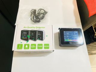 Detector de calidad del aire con conexión Wi-Fi. Permite monitorizar varios parámetros ambientales. - Mide PM2.5, PM10, CO2, HCHO, TVOC. - Indica temperatura y humedad. - Pantalla digital clara. Bateria recargable microUSB dentro parece tener un plastico pequeñito roto pero que no afecta a su funcionamiento, cuando lo agitas o lo mueves suena algo en su interior muy pequeñito