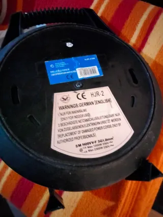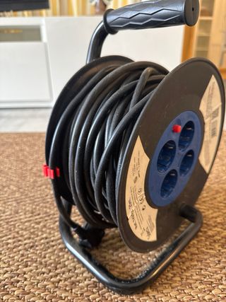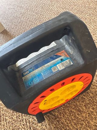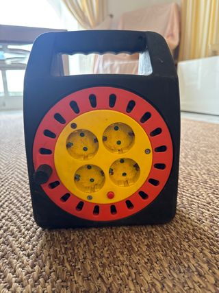 Enrollacables de la marca ExtraStar con cuatro enchufes. - Color negro, rojo y amarillo. - Asa para transporte. - Rueda para enrollar el cable.