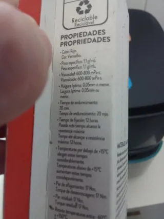 PATTEX Nural 50 es un fijador de tornillos y tuercas metálicas de color rojo. No sólo sirve como fijador sino que además actúa como un excelente sellador de uniones roscadas y acoplamientos. Tiene un tiempo de endurecimiento de 20 minutos y el tiempo para alcanzar la resistencia máxima es de 12 horas. En temperaturas por debajo de 15ºC, estos tiempos se pueden alargar considerablemente. Sirve para fijar tornillos, espárragos, pernos, tuercas, casquillos, cojinetes, retenes, anillos, rodamientos, tapones, ejes, poleas, bulones y demás elementos de fijación de bloque, culata, carburador, transmisión, embrague, dirección, engranajes,..