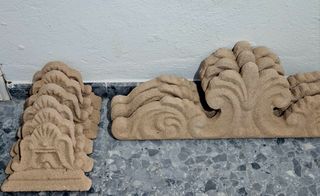 Precio final para todas. Conjunto de molduras de piedra con diseño ornamental. Para decoración, entrada, edificio, casa. - 3 piezas centrales con motivos vegetales, acrotera frontal. 75x25x3,5 cm. - 6 elementos laterales con volutas, para cornisa y otras zonas. 23x17x5 cm. - 20 bloques de piedra rectangulares. 22,5x14,5x3 cm. Recogida o venta en punto cercano.