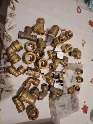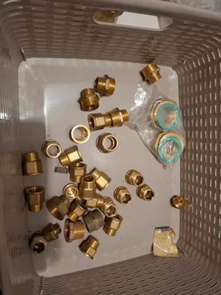 Lote de piezas de fontanería de latón, ideal para instalaciones y reparaciones. - Codos - Tes - Manguitos - Adaptadores - Válvulas - Racores - Varios tipos y tamaños.