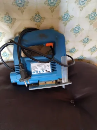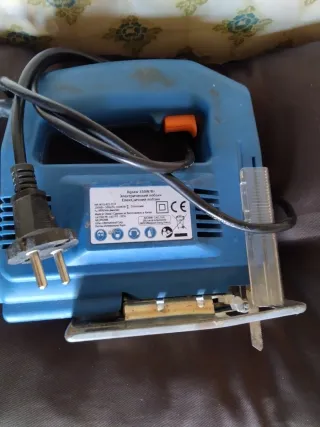Caladora eléctrica de color azul, ideal para trabajos de bricolaje y carpintería. - Diseño ergonómico para un agarre cómodo. - Cable de alimentación incluido.