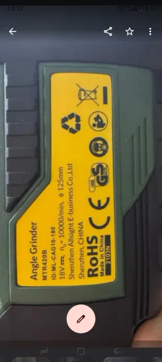 Amoladora angular de 18V con disco de 125mm. - Modelo: MTR420B - Velocidad: 10000 rpm - Fabricante: Shenzhen Allsight E-business Co.,Ltd - Certificación: CE, RoHS, GS - Fabricado en China