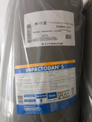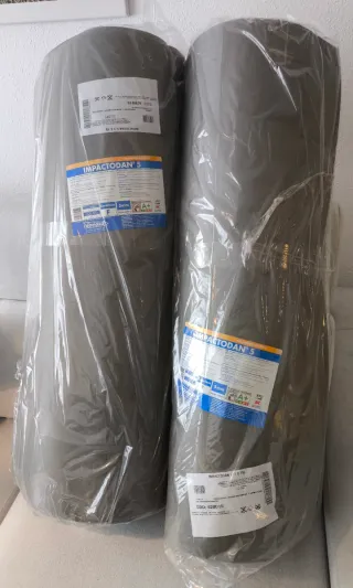 Dos rollos de IMPACTODAN 5 (2x15m). Nuevos a estrenar. Sin abrir. En su embalaje original. Láminas flexibles de polietileno reticulado de celda cerrada diseñada para el aislamiento acústico de ruidos de impacto. - Marca: Danosa - Modelo: IMPACTODAN 5 - Dimensiones: 2 x 15 m - Euroclase: F - Grosor: 5mm - Código: 620015 Con la compra se regala una pistola de espuma marca PENOSIL nueva a estrenar también. Sin abrir. Venta en Vinaroz (Castellón).