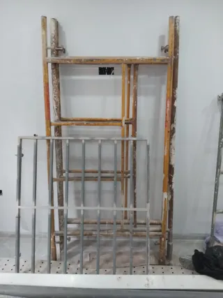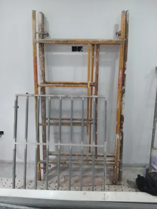 Se venden andamios metálicos, ideales para trabajos de construcción o reformas. - Estructura robusta de metal. - Color amarillo con detalles en naranja. - Incluye una reja metálica adicional.