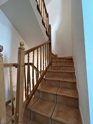 Barandilla de madera para escaleras, dividida en tres tramos. - Material: Madera. - Diseño clásico con balaustres torneados. - Ideal para renovar o complementar escaleras.