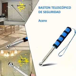 Bastón telescópico de seguridad con mango ergonómico. Ideal para protección y uso en diferentes superficies como cristales, baldosas o paredes. 120 cm de largo (extendido) - Mango de goma con detalles en azul. - Punta metálica esférica. - Extensible.