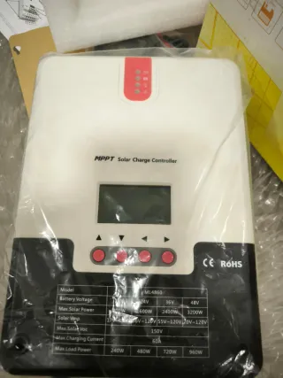 Regulador de carga solar MPPT modelo ML4860. - Voltaje de batería: 24V, 36V, 48V. - Potencia máxima solar: 600W, 2400W, 3200W. - Voltaje Vimp solar: 55V-120V. - Voltaje Voc solar: 150V. - Corriente de carga máxima: 60A. - Potencia máxima de carga: 480W, 720W, 960W.