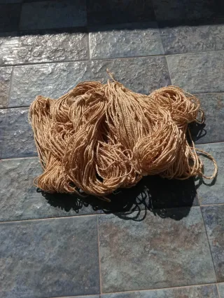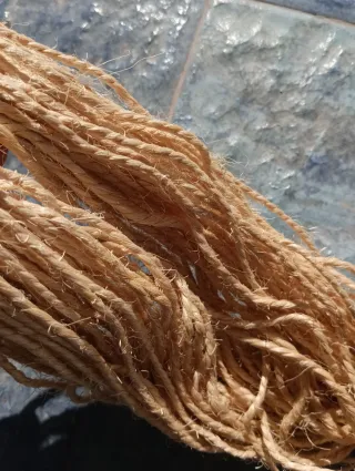 Rollo de cuerda de esparto o similar, ideal para la restauración y reparación de sillas o muebles. - Material: Fibra natural. - Color: Tostado. - Diámetro aproximado: 5 mm.