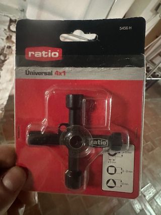 Llave multifunción para armarios eléctricos. - Diseño 4 en 1. - Incluye puntas para diferentes tipos de cerraduras. - Puntas: Ø 5 mm, 6-8 mm (cuadrado), 9 mm (triángulo). - Marca: Ratio.