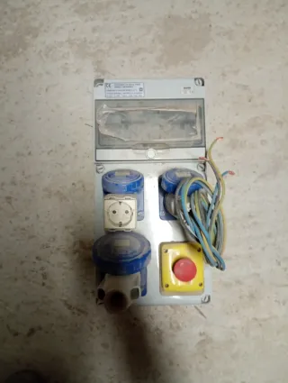 Cuadro eléctrico para obra o uso industrial. Incluye varios enchufes y un pulsador de emergencia. - Caja de distribución con tapa transparente. - Dos salidas de 16A y una de 32A. - Se incluyen los enchufes macho. - Enchufe industrial. - Pulsador de parada de emergencia rojo. -Conviene revisar. - Se incluyen los papeles con las instrucciones y el esquema eléctrico.