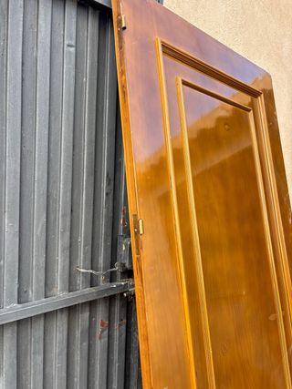 (3) Puerta de madera con un diseño clásico de dos paneles rectangulares. La superficie tiene un acabado brillante que resalta la veta de la madera. - Material: Madera - Color: Tono miel - Incluye manilla dorada Medidas: 0,82 cm de ancho. Alto 2,03 cm. Se venden 3 puertas o por separado (50 euros).