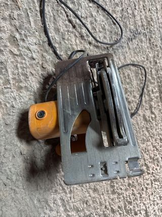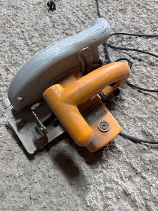 Herramienta eléctrica para cortar madera. - Cuerpo de plástico naranja. - Base metálica. - Cable de alimentación.