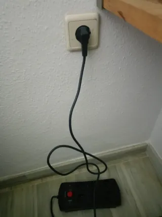 Regleta alargador de color negro con varios enchufes. - Cable de alimentación. - Enchufe a la pared.