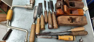 Conjunto de herramientas de carpintería para trabajar la madera. - Cepillos de carpintero - Formones de diferentes tamaños - Barrena - Taladro manual de manivela