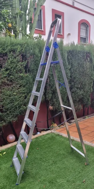 Escalera de aluminio con 8 peldaños. Es robusta y fácil de usar. - Material: Aluminio. - Número de peldaños: 8.