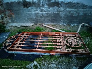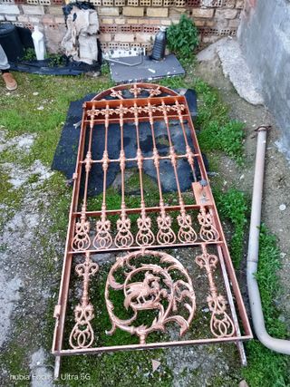 Puerta de hierro con diseño abatible y detalles en vidrio. - Medidas: 94 cm de ancho x 2.50 metros de alto. - Material: Hierro resistente. - Acabado: Diseño ornamental.