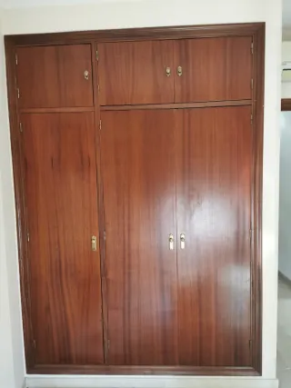 Conjunto de puertas de armario de madera con marco y premarco. Con altillos, un total de 3 de armario y 3 altillo. - Diseño clásico en madera oscura. - Tiradores dorados. Medidas alto desde embellecedor a embellecedor 2,37cm Puertas 40cm altillo 180cm armario. Ancho armario 170cm de embellecedor a embellecedor. Ancho de puertas 50cm. Desmontado, fácil. De transportar en una baca..