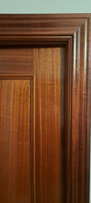 Puerta interior de madera con acabado en tono caoba. Presenta un diseño clásico con paneles. - Material: Madera - Color: Caoba