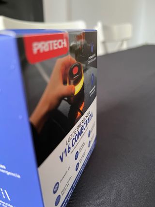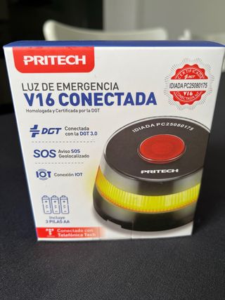 Luz de emergencia V16 conectada de la marca PRITECH, homologada y certificada por la DGT. - Conectada con la DGT 3.0. - Aviso SOS Geolocalizado. - Conexión IOT. - Incluye 3 pilas AA. - Conectado con Telefónica Tech.