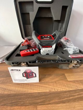 Nivel láser rotativo de la marca Metrica, ideal para trabajos de construcción y medición. - Incluye maletín de transporte. - Diseño robusto en color rojo y negro.