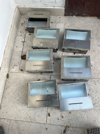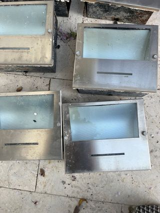 Conjunto de focos de exterior con carcasa metálica y frontal de cristal. Son robustos y están diseñados para resistir las inclemencias del tiempo. Algunos no funcionan - Material: Metal y cristal. - Diseño: Moderno y funcional.
