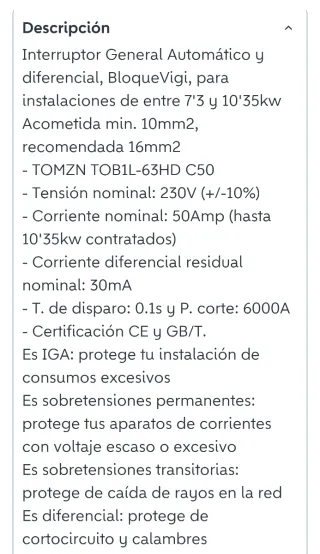 Interruptor General Automático con sobretensiones permanentes y transitorias, que además es diferencial - Elige la Corriente nominal que necesitas, si no lo sabes consulta: 16, 20 o 25A=30€; 32, 50 o 63A=35€ - La mayoría de las viviendas construidas o actualizadas después de 1983: 25Amp - Sensibilidad: 30mA. - Tiempo de actuación: 0.1s. - Tensión nominal: 230V~ (+/-10%) - Cumple con normas IEC61009-1, GB/T 16917.1, GB/T 16917.22. - Capacidad de cortocircuito: 6000A.