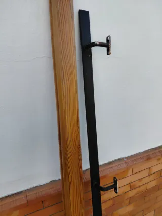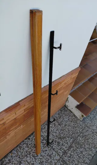 Barandilla de madera con soporte de pared para escaleras o pasillos. Se encuentra en buen estado. A recoger en Bormujos. - Pasamanos de madera. - Soporte de metal negro. ( Medidas: 195x7 )