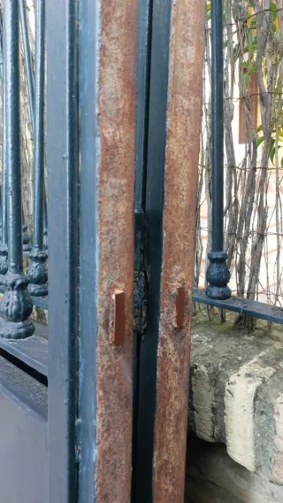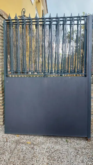 Se venden dos cancelas de hierro con un diseño clásico, con cerrojo y llave incluidas. Perfectas para delimitar espacios exteriores con seguridad y estilo. Faltarían los agarres a la pared, que se cortaron para colocar una automática. - Cada hoja mide 1.50 metros de ancho por 2 metros de alto. - Fabricadas en hierro resistente. - Diseño con barrotes superiores y panel inferior sólido.