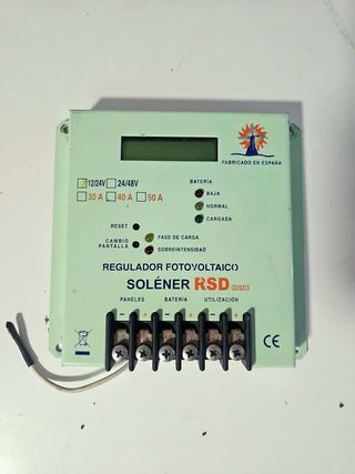 Regulador fotovoltaico Solener RSD compatible con sistemas 12/24V con selección de 10A a 30A según instalación solar. Incluye display y leds para monitorizar batería, carga y protecciones. Procedente de desmontaje, verificado y listo para uso. Apto para autoconsumo aislado en casas, casetas y vehículos camper. Envio disponible OiPlay Energías Renovables 644008665 Etiquetas: regulador, 24V, 48V, Solener, solar