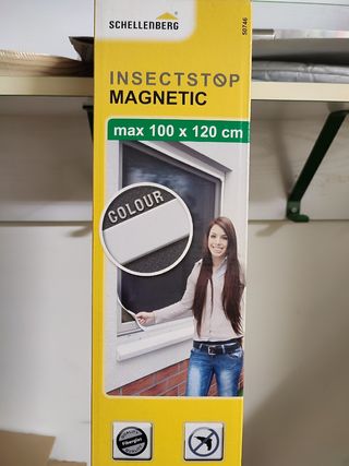 Mosquitera magnética para ventana de la marca Schellenberg, nueva a estrenar. Ideal para ventanas de hasta 100 x 120 cm. - Fácil instalación. - Material de fibra de vidrio. - Color blanco. - Sistema magnético para un cierre sencillo.