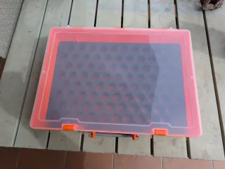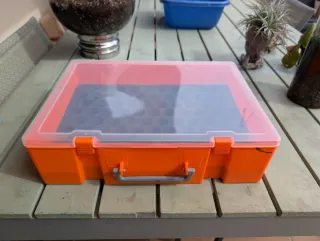 Capacidad para 84 botes vallejo o similares Maletín de plástico naranja con tapa transparente para organizar materiales de arte o manualidades. - Asa gris plegable para facilitar el transporte. - Cierres laterales naranjas. - Bandeja interior con compartimentos.
