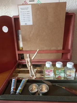 Caja de madera para materiales de pintura de la marca Talens. Incluye varios accesorios. - Lienzo de madera. - Botes de médium y barniz. - Tubos de pintura. - Paleta. - Figura de madera.